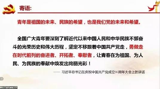 最后,方老师借用习近平总书记在庆祝中国共产党成立95周年大会上的讲话作为寄语,青年是祖国、民族和党的希望与未来,期望当代青年在党旗飘扬下,勇做时代前列的奋进者、开拓者、奉献者,在为祖国、人民、民族的奉献中焕发出青春的绚丽光彩。