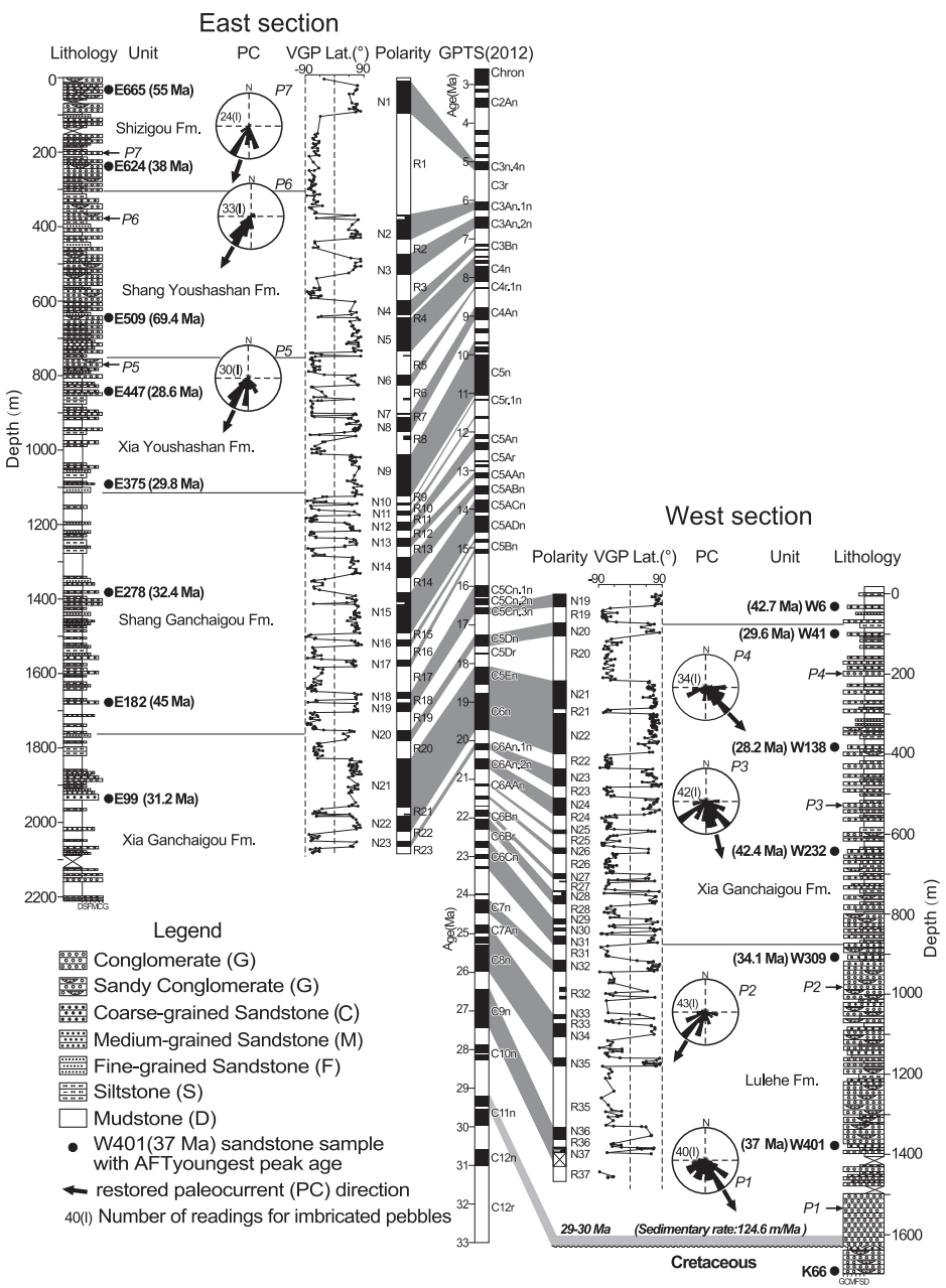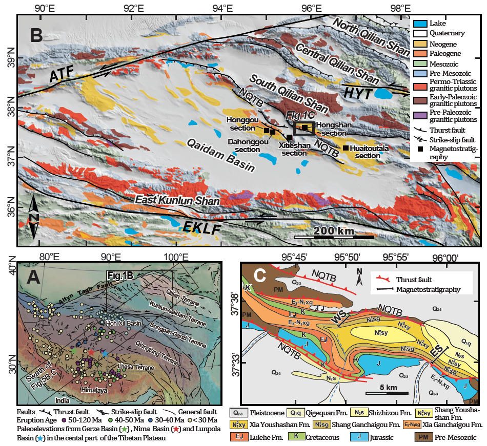 Our sampled sections are referred to as the Hongshan West and the Hongshan East sections, which are exposed in the north and south flanks of a syncline, respectively, related to the NQTB (Fig. 1C). Based on magnetostratigraphies combined with detrital apatite fission-track ages, we date the basin fills to be from ca. 30 to 4.8 Ma(Fig. 2).
