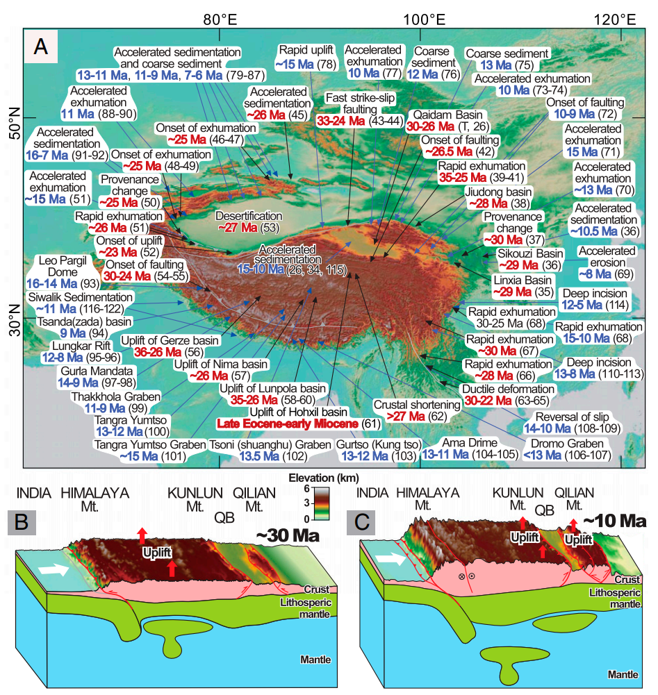Figure 3: (A) Distribution of the major lines of evidence for ca. 30 and 10 Ma deformation/uplift in the Tibetan Plateau. (B) Schematic tectonic diagram illustrates the removal of mantle lithosphere beneath south and central Tibet driving plateau surface uplift and outward growth at ca. 30 Ma. (C) Following lithospheric thickening, convective instability triggers removal of lithospheric mantle beneath northern Tibet, causing the second-stage deformation and growth of the plateau to its recent northeastern margin in ca. 10 Ma.