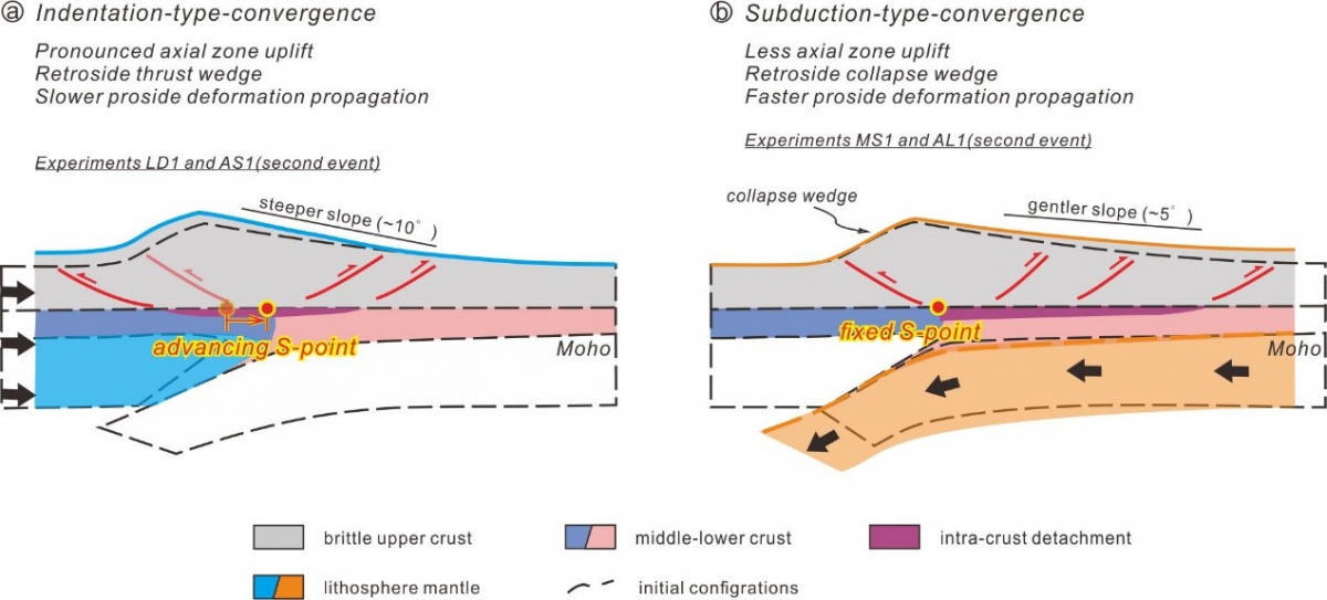 This contribution presents sandbox experiments simulating the orogens evolving under convergence modes that correspond to the end-member geodynamics. The architecture of modeled orogen is analyzed to obtain high-resolution perspective on the shallow fault styles, seismicity, and uplift patterns that can directly be observed in the field. The results reveal that: indentation-type convergence promotes deformation propagation toward the overriding plate and will result in a doubly vergent orogen in the final mature stage (Figure 1A); Whereas mantle-subduction-type convergence enhances orogen expansion above the subducting plate only, thus single vergent orogenic wedge persists (Figure 1B). Such contrast is a reflection of distinct deformation partition modes determined by the applied convergence. The indenting block localizes more deformation in its front, producing a fast-uplift axial zone that can reach the critical height required for overriding plate deformation (McClay and Whitehouse, 2004). In comparison, the axial zone above the subducting plate uplifts slowly, and more deformation is transferred into the subducting plate. Notably, lower axial zone here additionally determines a small topographic relief.