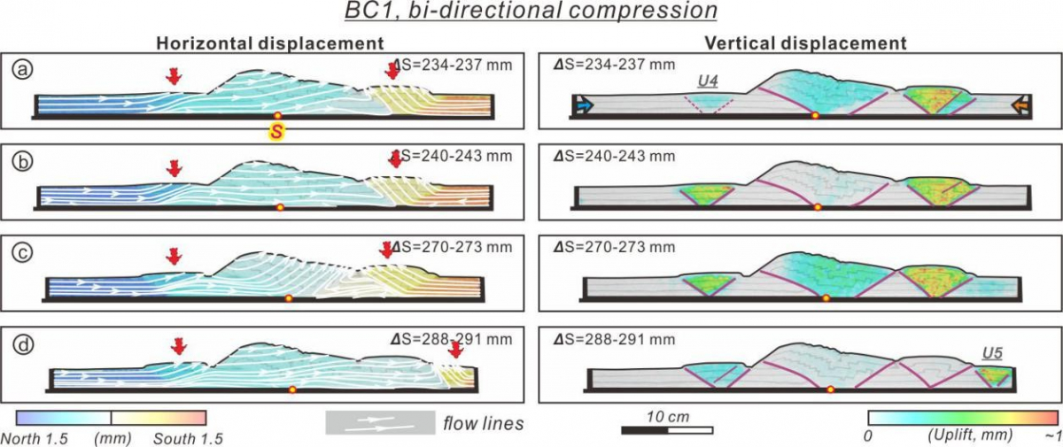 Figure 2. Particle Image Velocimetry analysis on selected snapshots of BC1, showing temporal deformation localization. The left column shows colored horizontal displacement with flow lines, which represent temporal motion tendency of the materials within the model. Red arrows mark the location of rapid uplifting. The right column shows incremental uplift (vertical displacement).