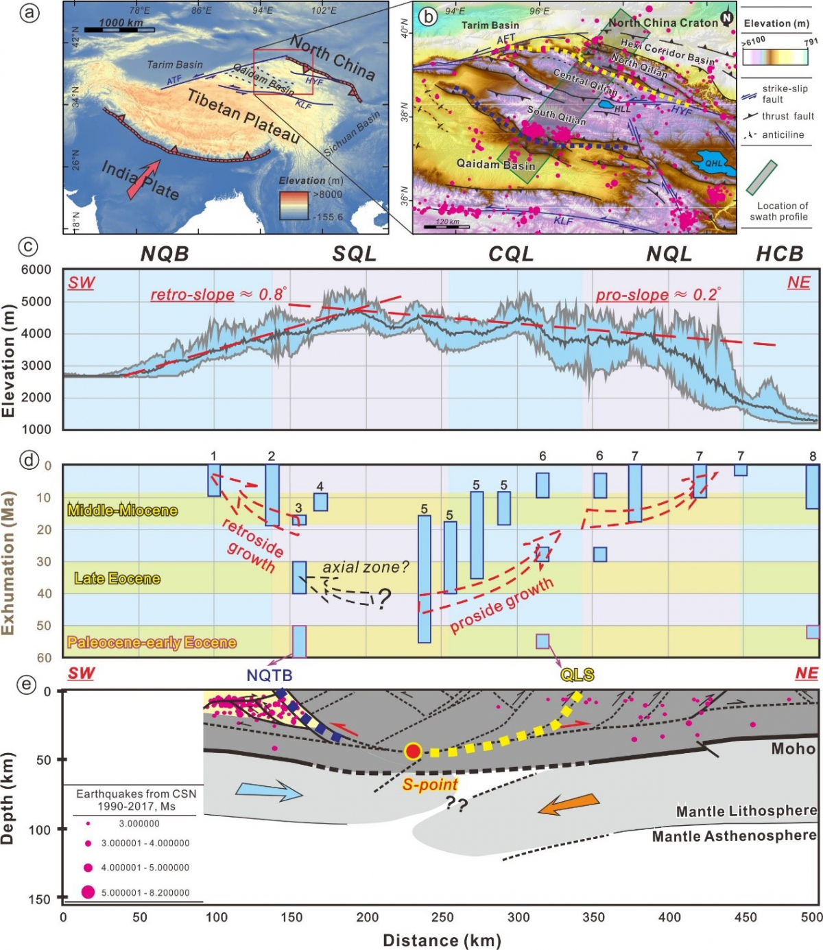 Figure 3. (a-b) Location of the Qaidam-Qilian thrust belt in northern Tibetan Plateau. (c)Swath profile (80 km-wide) across the Qaidam-Qilian region shows regional topo-graphic relief with regional surface slopes indicated. Notably, local relief around the transition zone between NQL and HCB is not considered here. The profile coverage is indicated by green rectangular box in Fig. b.(d) Cenozoic rapid exhumation ages obtained around and in the same swath profile shown in Fig. b. The dashed arrows outline a hypothetical Cenozoic deformation sequence according to our sandbox experiments. (e)Structural cross-section of the northern Tibetan Plateau. Earthquakes (from CSN 1990-2017) within the swath profile of Fig.10b are projected as well. NQTB and QLS are considered as the bounded faults of axial zone in the Cenozoic Qilian Shan thrust wedge. Lithospheric structure from Gao et al. (1999), crust structure from Yin et al. (2008). Yellow dash line in bold is the inferred along-dip geometry of Qilian su-ture (QLS). Its map view extension is also marked on Fig.10b after Zuza et al. (2016). ATF: Altyn Tagh Fault; KLF: Kunlun fault; HYF: Haiyuan fault; NQB: northern Qaidam Basin; S/C/NQL: southern/central/northern Qilian Shan; HCB: Hexi Corridor Basin; HLL: Hala Lake; QHL: Qinghai Lake.